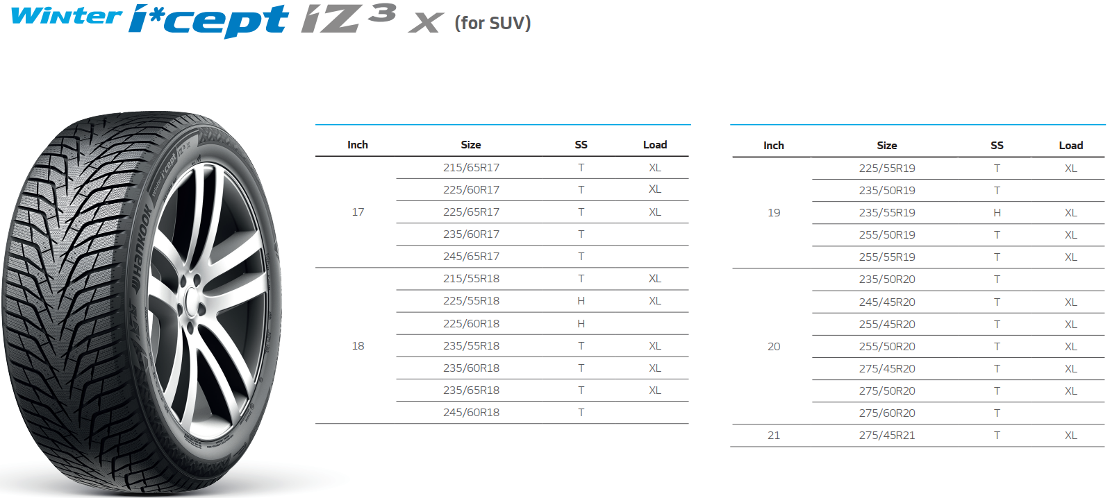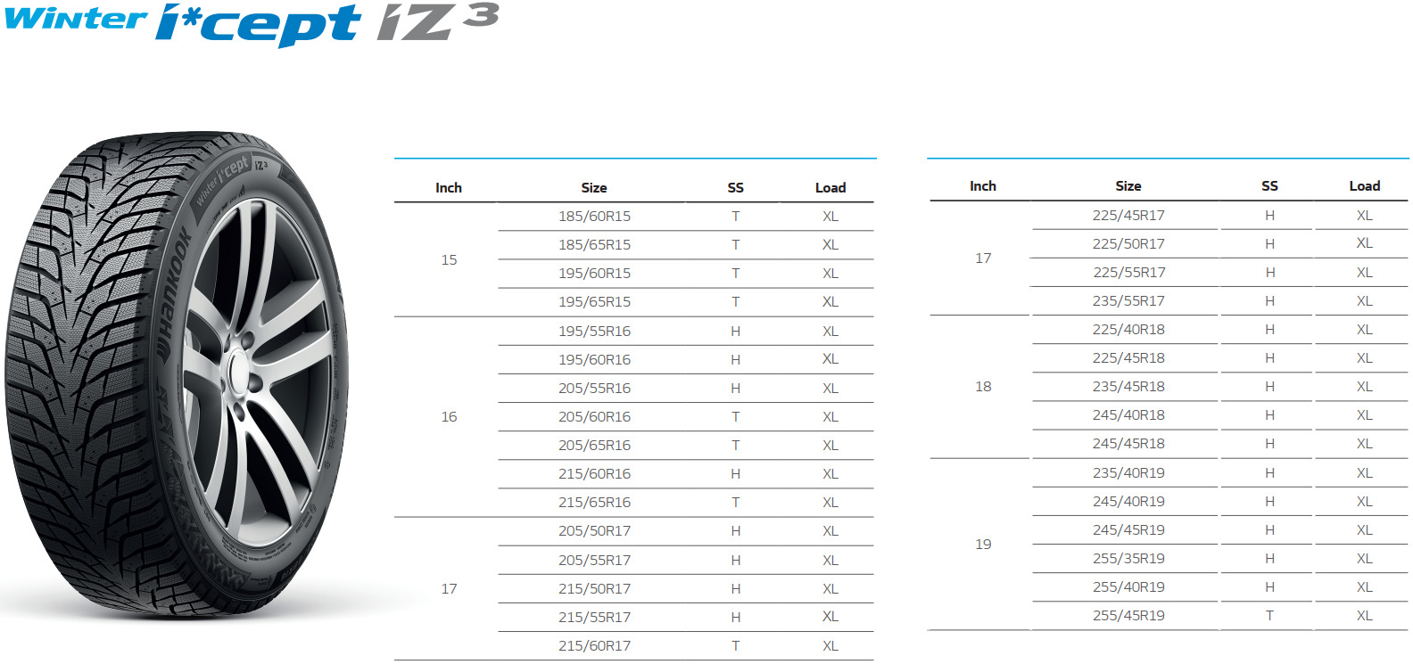 Winter i*cept iZ3 та i*ceptiZ 3 X представлені у 51 розмірі від 15 до 20 дюймів у комплектаціях седанів та позашляховиків. Обидві моделі постачаються із гарантією на пробіг до 80 000 кілометрів.