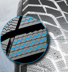 - 3D ламелі та V-подібні широкі канавки забезпечують покращене гальмування та керування на вкритих льодом , мокрих та сухих дорогах.